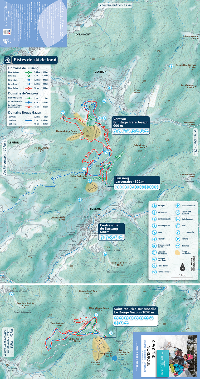 3 trails on the Rouge Gazon ski resort inSaint-Maurice sur Moselle, covering 20 km (one 3.5 km green trail, one 7 km blue trail and one 10 km red trail). 2 snowshoeing routes (in yellow on the map) starting from Rouge Gazon:"The discovery": 3km and "The Explorer": 6.3 km. Free access. The map with the tracks downloadable here.
